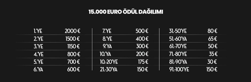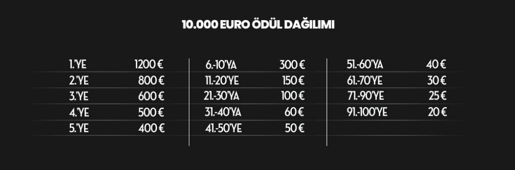 - Turnuva sonunda en iyi 100 oyuncu 10.000 Euro'luk ödül havuzunu paylaşacaktır.